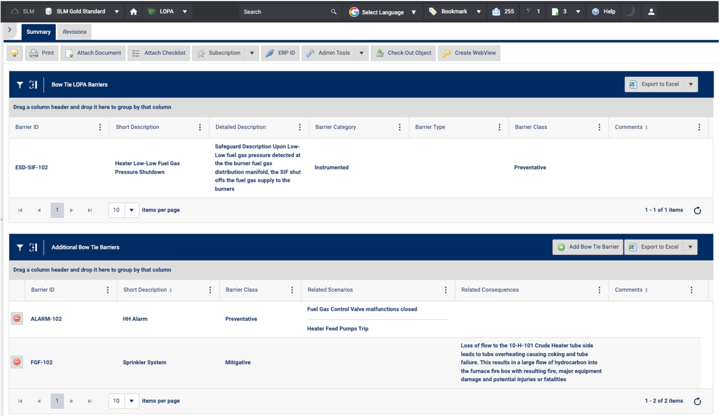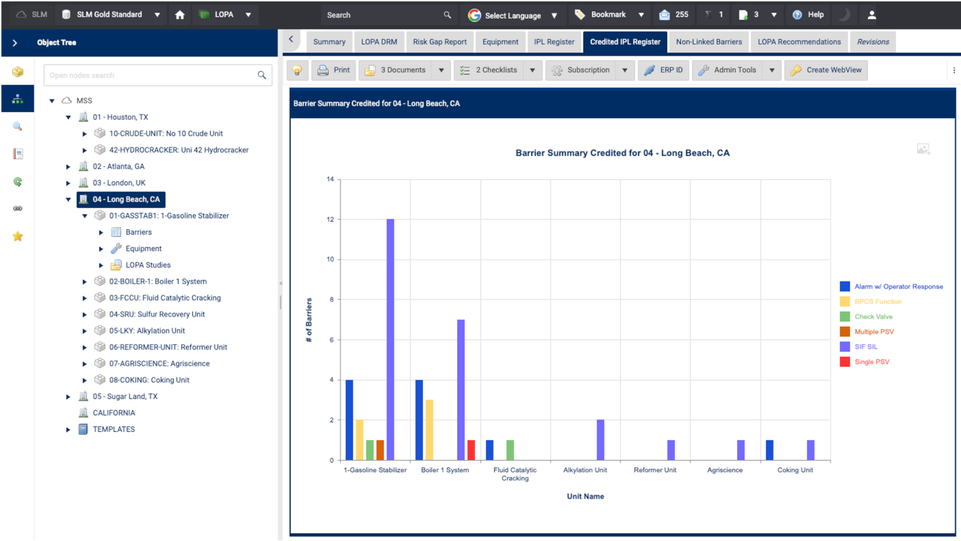 Maintain a continuously updated view of the barriers credited in risk assessments across the facility. The Credited IPL Register provides an evergreen inventory of safeguards and independent protection layers identified in LOPA studies, allowing organizations to understand how risk reduction is achieved across units and systems. Summary reporting provides visibility into the types and distribution of barriers implemented, supporting ongoing barrier management, verification, and assurance of the protections relied upon in risk assessments.
