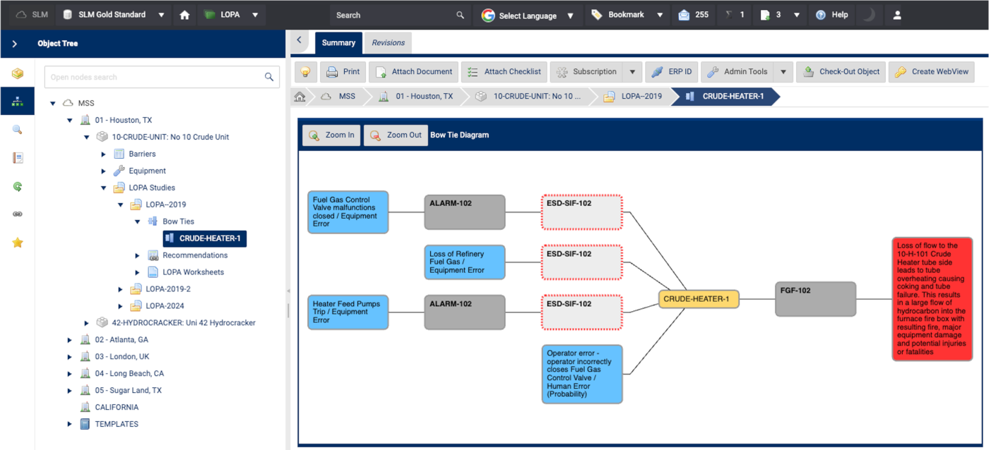 Create Bowtie diagrams directly within the system or generate them automatically from existing LOPA worksheets. The module allows organizations to visualize the relationship between threats, barriers, and consequences by leveraging the causes and safeguards already defined during risk assessments. By building Bowties from LOPA data, teams can quickly transform detailed risk analysis into a clear visual representation of how hazards are prevented and mitigated across the process.